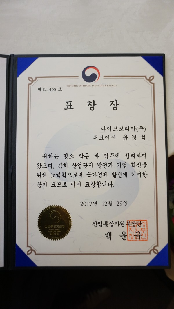 이날 나이프코리아(주) 유경석대표는 지난한해 산업단지 발전과 국가경제발전에 노력한 공이 인정되어 산업통상자원부 장관상을 표창하였습니다.